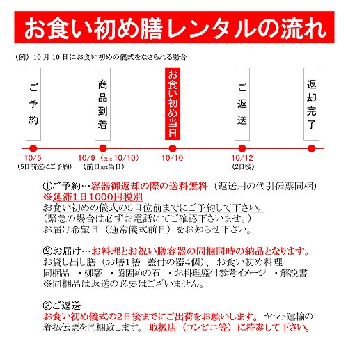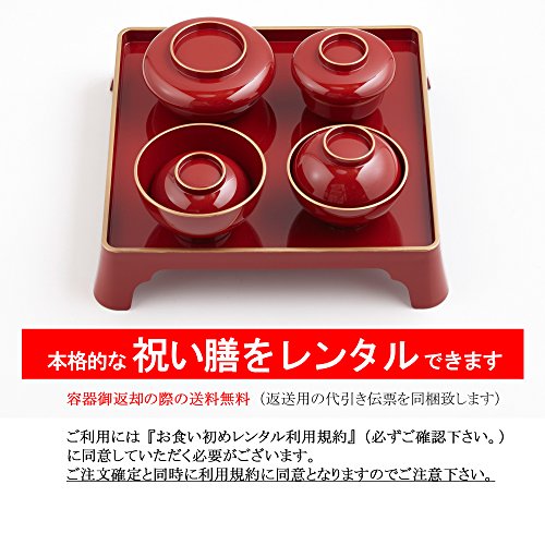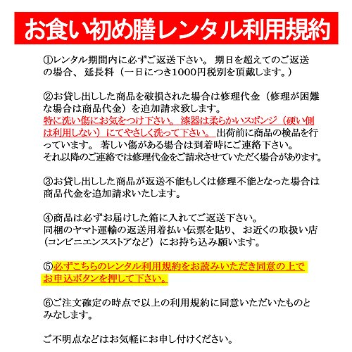 必ず下記の利用規約をご確認下さい。 (1)レンタル期間内に必ずご返送下さい。期日を超えてのご返送の場合、延長料(一日につき1000円税別を頂戴します。) (2)お貸し出しした商品を破損された場合は修理代金(修理が困難な場合は商品代金)を追加請求致します。 特に洗い傷にお気をつけ下さい。漆器は柔らかいスポンジ(硬い側は利用しない)にてやさしく洗って下さい。出荷前に商品の検品を行っています。著しい傷がある場合は到着時にご連絡下さい。 それ以降のご連絡では修理代金をご請求させていただく場合があります。 (3)お貸し出しした商品が返送不能もしくは修理不能となった場合は商品代金を追加請求いたします。 (4)商品は必ずお届けした箱に入れてご返送下さい。 同梱のヤマト運輸の返送用着払い伝票を貼り、お近くの取扱い店(コンビニエンスストアなど)にお持ち込み願います。 (5)必ずこちらのレンタル利用規約をお読みいただき同意の上でお申込ボタンを押して下さい。 (6)ご注文確定の時点で以上の利用規約に同意いただいたものとみなします。 ご不明点などはお気軽にお申し付けください。 ご注意(免責)> 必ずお読み下さい ※お料理の賞味期限は発送日から2日間です。 遠方の場合はお届日中の場合もございます。 ※ご注文を頂いてから、お届け日に合わせてお料理を作り、お届け致します。 急なご注文は地域によりましては間に合わない場合がございます。その際は当社より別途ご連絡ご相談をさせていただきます。 できるだけ注文~お届け日まで日時に余裕を持っていただきますようお願いいたします。