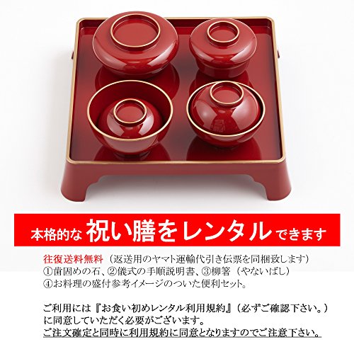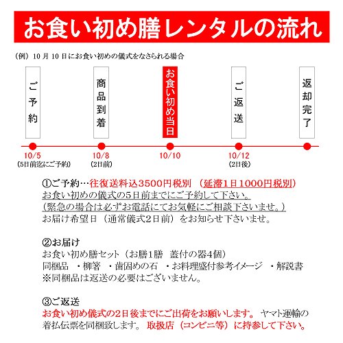 - 復路の送料込(代引き伝票入)必ず利用規約(商品説明欄)をお読みいただき期限内にご返却をお願い致します。期日を過ぎると延滞料がかかります。※1月2日~1月7日および8月13日~8月18日のお届けは休業期間中のためお食い初めレンタル容器セットをお届けできません。