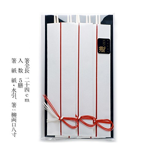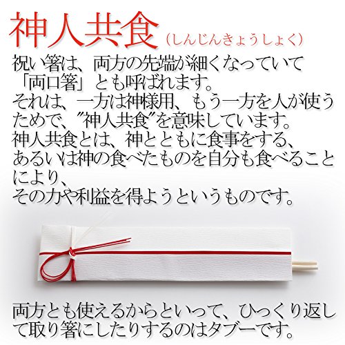 [神人共食(しんじんきょうしょく)] 祝い箸は、両方の先端が細くなっていて 「両口箸」とも呼ばれます。 それは、一方は神様用、もう一方を人が使う ためで、"神人共食"を意味しています。 神人共食とは、神とともに食事をする、 あるいは神の食べたものを自分も食べること により、 その力や利益を得ようというものです。 両方とも使えるからといって、ひっくり返し て取り箸にしたりするのはタブーです。 箸全長 二十四cm 入 数 5膳 箸 紙 紙・水引、箸:柳両口八寸