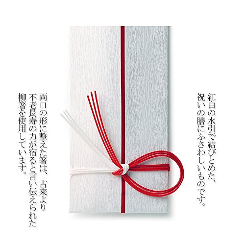 - 紅白の水引で結びとめた、 祝いの膳にふさわしいものです。両口の形に整えた箸は、古来より 不老長寿の力が宿ると言い伝えられた 柳箸を使用しています。