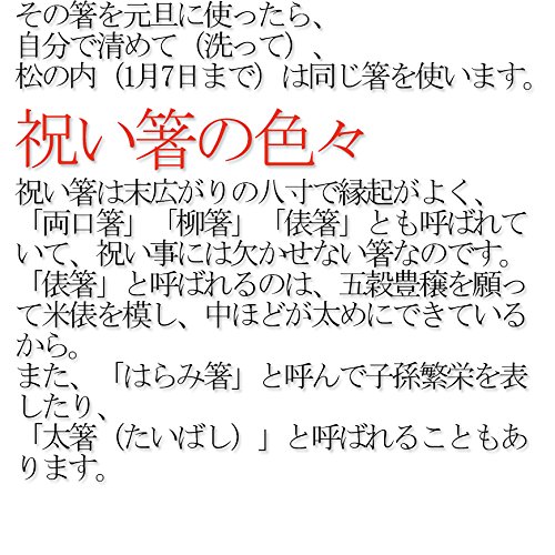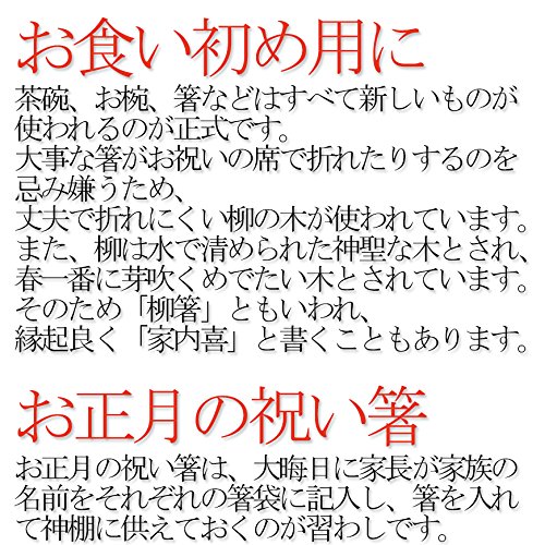- [お正月の祝い箸] お正月の祝い箸は、大晦日に家長が家族の 名前をそれぞれの箸袋に記入し、箸を入れ て神棚に供えておくのが習わしです。その箸を元旦に使ったら、 自分で清めて(洗って)、 松の内(1月7日まで)は同じ箸を使います。