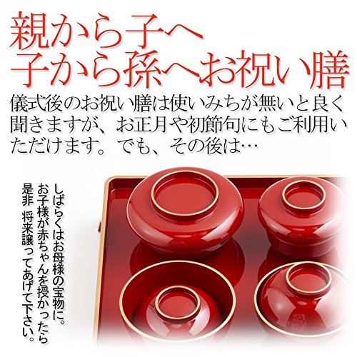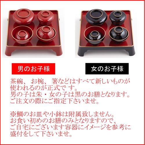 「お食い初め」または「食い初めの祝い」は、 赤ちゃんに生まれてはじめてご飯を食べさせる儀式で、 赤ちゃんが一生食べ物に困らないようにという願いがこめられた内祝。 生後百日目を目安に、赤ちゃんの発育を考慮して、 離乳期に合わせて行なうのが一般的です。 「百日の祝い(ももかのいわい)」や歯の生え始める頃なので 「歯がため」「箸ぞろえ」「箸始め」とも言われます。 双方の両親を自宅に招き、赤ちゃんが大人と同じようなものを食べて 産神様に祈願とお祝いをします。 お食い初めのしかたは、一番長寿の祖父祖母が 膝に赤ちゃんを抱き食べる真似をさせるというものです。 お膳には塗りの器を用意します。 正式には、母方の実家から祝い膳が贈られ、 それを使うのがしきたりです。 茶碗、お椀、箸などはすべて新しいものが使われるのが正式です。 食器は高足の御膳で色も赤ちゃんの性別で異なり、 男児は内外ともに朱色で 女児は黒色で内側が赤色のものを用意します。 本膳料理は一汁三采で、お赤飯とお吸い物に、鯛、 それに煮物、香の物が添えられます。 鯛はめでたいときに使われる魚です。 これに昆布、勝栗など縁起のよいものが使われます。 また、丈夫な歯が育つようににと、 紅白の餅、小石、梅干などが添えられることもあります。