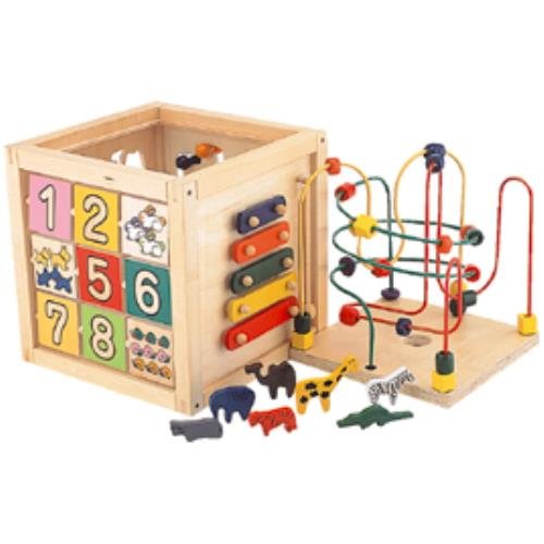 四角い箱にあそびがいっぱい!立方体の木箱に木琴・ビーズコースター・はめこみパズル・迷路・数合せと盛りだくさんの遊びがつまっています。●内容/スティック、動物(らくだ、わに、しまうま、かば、ぞう、きりん、とら)●サイズ/29.5×29.5×29.5cm