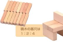 三面図を見ながら、基尺が1:2:4の整数比の積木を積んで、数学や幾何学の基礎力を育てるセット。