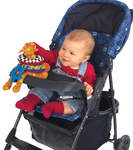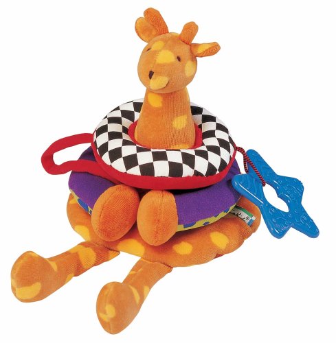 ベビーカーのフロントバーに取り付けるタイプのぬいぐるみ。キリンさんの首にリングを通して遊ぶことができる。