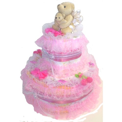 可愛いピンク親子くまさんのぬいぐるみが付いた【おむつケーキ】。おむつだけでなく、ケアベアのバスタオルが入っていますので、通常のおむつケーキより更に実用的で豪華なプレゼントです。 レースをタップリ使い、サテンリボン、メタルリボン、フリルリボンで飾りました。いちごモチーフ、さくらんぼモチーフ、リボンモチーフ、お花モチーフとトッピングもたくさんです。 おむつは一枚一枚OPPフィルムで個包装していますので清潔・衛生的です。 しばらく飾って楽しめて、その後、紙おむつを使用できる・・・ということで実用的で大人気の「おむつ」でできたデコレーションケーキ。出産祝いなどに最適。