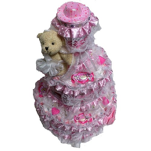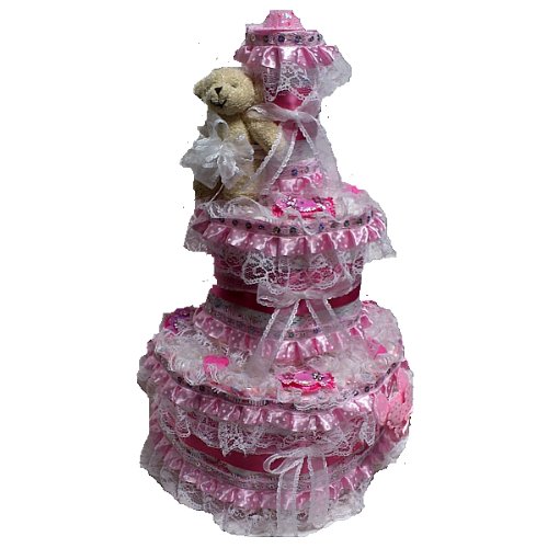こちらは3段のおむつケーキになります。 おむつケーキ全体を白いレースで贅沢に包み、ピンクの水玉フリルレース、ピンクのサテンリボンと白いメタルリボン、ピンクのリボンモチーフ、お花モチーフ、ミニハットなどで豪華に飾りました。2段目にはくまさんをセッティング。こちらは携帯などに付けていただけるストラップ用のぬいぐるみになります。ケアベアのフェイスタオルも付いています。 おむつは一枚一枚OPPフィルムで個包装していますので清潔・衛生的です。 しばらく飾って楽しめて、その後、紙おむつを使用できる・・・ということで実用的で大人気の「おむつ」でできたデコレーションケーキ。出産祝いなどに最適。