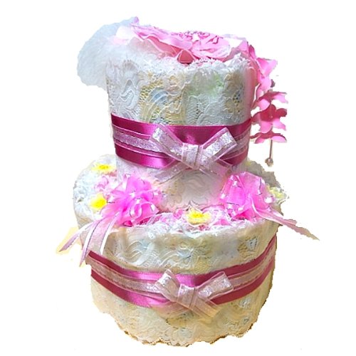 おむつケーキ全体を淡いピンクのレースで包み、ピンク系のリボンでデコレーションしました。 トップの大きなフラワーは七五三用の髪飾りとしてお使いいただけます。 フリルリボン、黄色の小花モチーフで可愛く仕上げてあります。 おむつは一枚一枚OPPフィルムで個包装していますので清潔・衛生的です。 しばらく飾って楽しめて、その後、紙おむつを使用できる・・・ということで実用的で大人気の「おむつ」でできたデコレーションケーキ。出産祝いなどに最適。