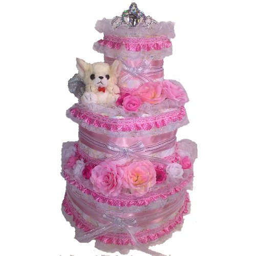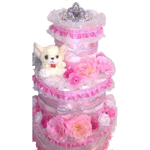 こちらは紙おむつを56枚使用したデラックス3段のおむつケーキになります。圧倒的な大きさで存在感たっぷりです。とても華やかでゴージャスなおむつケーキになっています。 おむつケーキ全体を白いレースで贅沢に包み、ピンクのフリルレース、ピンクのサテンリボンとメタルリボン、お花などで豪華に飾りました。2段目にはチワワのぬいぐるみをセッティング。トップにはティアラの髪飾りをあしらいました。※ティアラが画像のものと少し違うデザインに変更になりました。材質や品質には差異はございません。 おむつは一枚一枚OPPフィルムで個包装していますので清潔・衛生的です。 しばらく飾って楽しめて、その後、紙おむつを使用できる・・・ということで実用的で大人気の「おむつ」でできたデコレーションケーキ。出産祝いなどに最適。