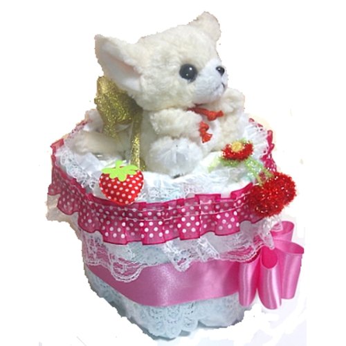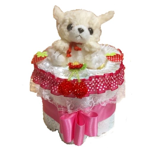 おむつケーキ【ミニ1段】出産祝い女の子用スイートフルーツチワワのぬいぐるみ付き