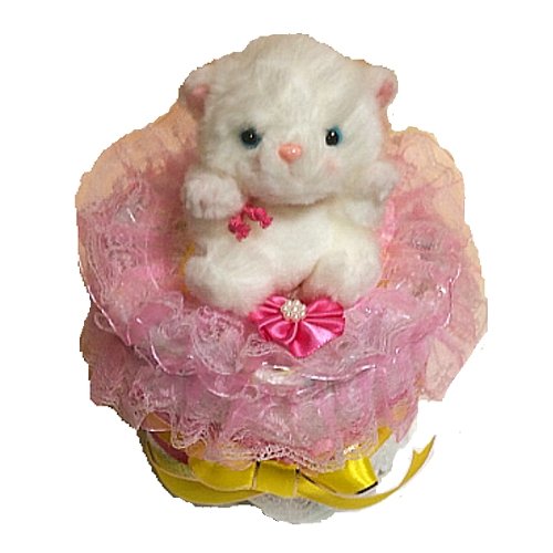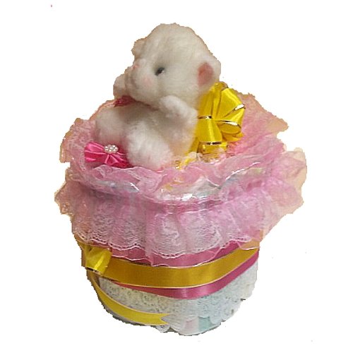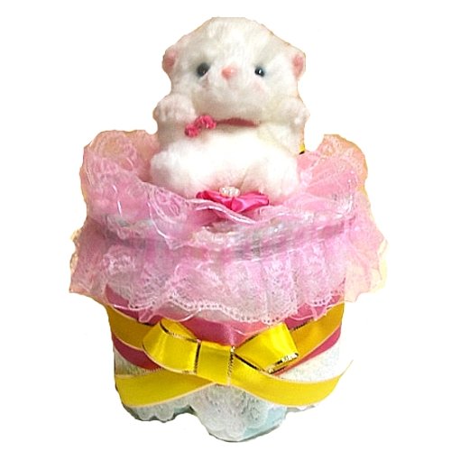 おむつケーキ【ミニ1段】出産祝い女の子用ピンク&イエロー にゃんこのぬいぐるみ付き