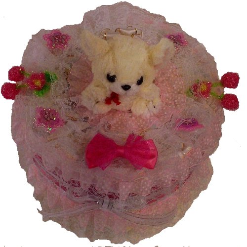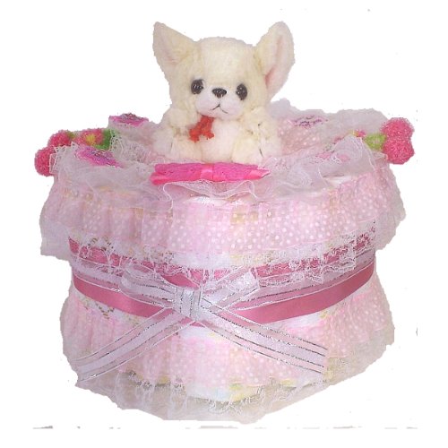 可愛いチワワのぬいぐるみが付いた【おむつケーキ】。人気の姫系です。 フリフリの水玉レースとピンクのリボン、さくらんぼ・・・とろけるような甘さです。 たっぷりとレースを使い、サテンリボン、フリルリボン、メタルリボンで飾りました。可愛さいっぱいの姫系おむつケーキです。 おむつは一枚一枚OPPフィルムで個包装していますので清潔・衛生的です。 しばらく飾って楽しめて、その後、紙おむつを使用できる・・・ということで実用的で大人気の「おむつ」でできたデコレーションケーキ。出産祝いなどに最適。