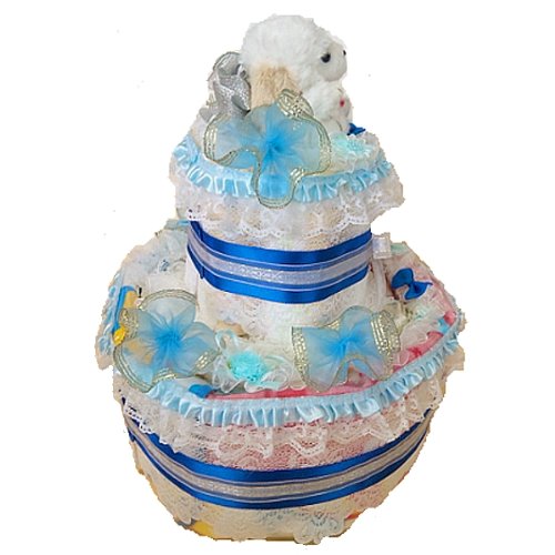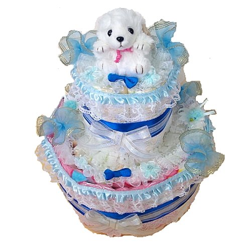 可愛いプードルのぬいぐるみが付いた【おむつケーキ】。ミッキーとミニーのBIGバスタオルと可愛いバスの絵柄のスタイが付いています。 たっぷりと白レースを使い、サテンリボン、フリルリボン、メタルリボンで飾りました。水色のリボンをアクセントにしてあります。 おむつは一枚一枚OPPフィルムで個包装していますので清潔・衛生的です。 しばらく飾って楽しめて、その後、紙おむつを使用できる・・・ということで実用的で大人気の「おむつ」でできたデコレーションケーキ。出産祝いなどに最適。