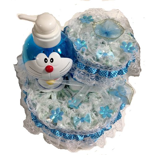 可愛いドラえもんのシャンプーボトルが付いた【おむつケーキ】。男の子への出産祝いに最適です。 たっぷりと白レースを使い、サテンリボン、フリルリボン、メタルリボンで飾りました。水色のリボンモチーフをアクセントにしてあります。 おむつは一枚一枚OPPフィルムで個包装していますので清潔・衛生的です。 しばらく飾って楽しめて、その後、紙おむつを使用できる・・・ということで実用的で大人気の「おむつ」でできたデコレーションケーキ。出産祝いなどに最適。