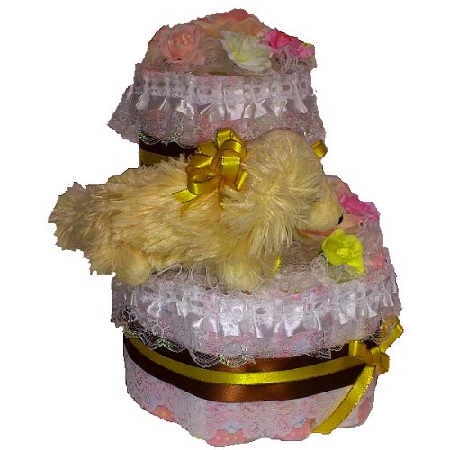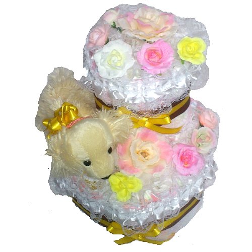 可愛いダックスのぬいぐるみが付いた【おむつケーキ】。2段目をずらして前面にスペースを取った変形タイプです。ブラウンのサテンリボンにイエローリボンをあしらい、ゴージャスさと品格を兼ね備えた仕上がりになっています。 たっぷりと白レースを使い、フラワーで飾りました。ダックスのぬいぐるみはふわふわとしたとても柔らかい手触りです。 おむつは一枚一枚OPPフィルムで個包装していますので清潔・衛生的です。 しばらく飾って楽しめて、その後、紙おむつを使用できる・・・ということで実用的で大人気の「おむつ」でできたデコレーションケーキ。出産祝いなどに最適。