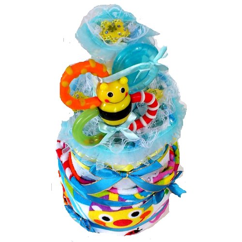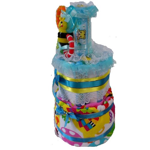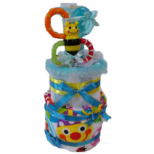 こちらは紙おむつを15枚使用した3段のおむつケーキになります。存在感たっぷりです。とても華やかでゴージャスなおむつケーキになっています。 おむつケーキを白いレースでに包み、水色のフリルレース、サテンリボン、モチーフなどで豪華に飾りました。サッシーsassyの歯固めとバスタオルが付いています。歯固めはバンブルバイツ。一番人気の楽しい歯固めです。冷蔵庫でひんやりひやすこともできます。sassyサッシーのバスタオルのサイズはタテ120xヨコ60cmです 。 おむつは一枚一枚OPPフィルムで個包装していますので清潔・衛生的です。 しばらく飾って楽しめて、その後、紙おむつを使用できる・・・ということで実用的で大人気の「おむつ」でできたデコレーションケーキ。出産祝いなどに最適。