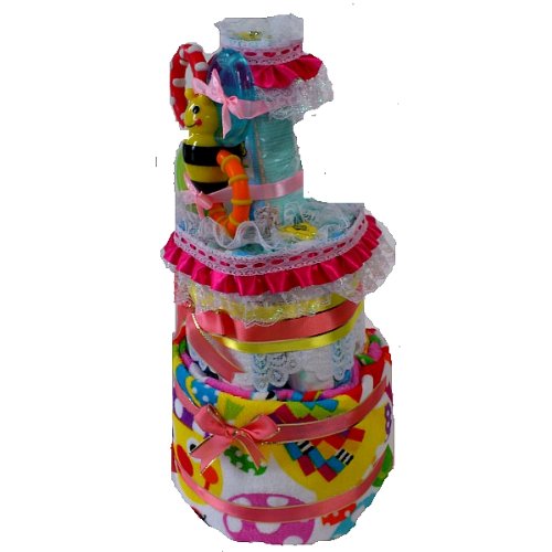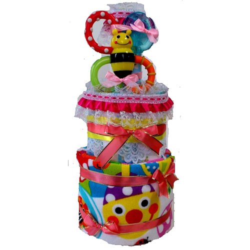 こちらは紙おむつを15枚使用した3段のおむつケーキになります。存在感たっぷりです。とても華やかでゴージャスなおむつケーキになっています。 おむつケーキを白いレースでに包み、フリルレース、サテンリボン、モチーフなどで豪華に飾りました。サッシーsassyの歯固めとバスタオルが付いています。歯固めはバンブルバイツ。サッシーの一番人気の楽しい歯固めです。冷蔵庫でひんやりひやすこともできます。sassyサッシーのバスタオルのサイズはタテ120xヨコ60cmです 。 おむつは一枚一枚OPPフィルムで個包装していますので清潔・衛生的です。 しばらく飾って楽しめて、その後、紙おむつを使用できる・・・ということで実用的で大人気の「おむつ」でできたデコレーションケーキ。出産祝いなどに最適。