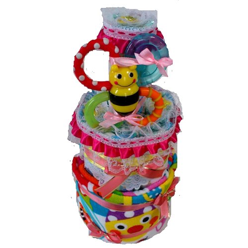おむつケーキ【3段】メリーズSサイズ使用sassy歯固め&タオル付き サッシー 出産祝い女の子用オムツケーキ