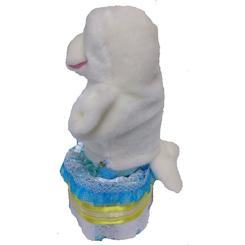 おむつケーキ全体を白いレースで包み、サテンリボン、フリルリボンで飾りました。ミニサイズのおむつケーキです。小型の2段おむつケーキです。ハンドパペットが付いていますので、赤ちゃんをあやすのにぴったり。ハンドパペットは中に手を入れて動かせるぬいぐるみです。 おむつは一枚一枚OPPフィルムで個包装していますので清潔・衛生的です。 しばらく飾って楽しめて、その後、紙おむつを使用できる・・・ということで実用的で大人気の「おむつ」でできたデコレーションケーキ。出産祝いなどに最適。