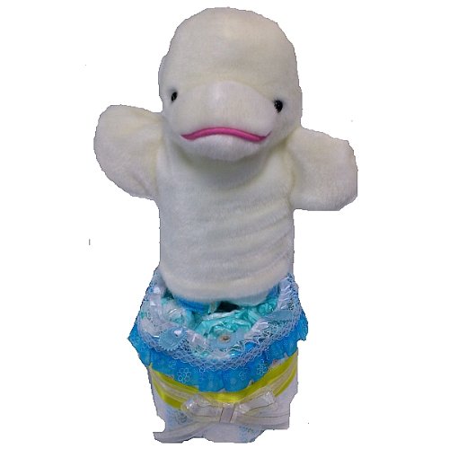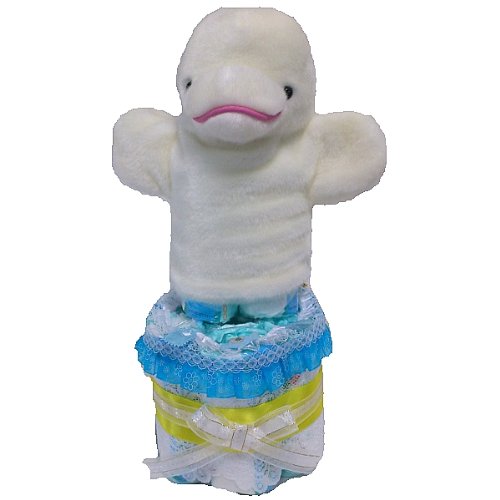 おむつケーキ 出産祝いパンパースM小型2段オムツケーキ ハンドパペット付き男の子用【白イルカ】