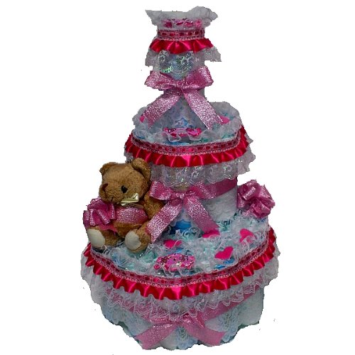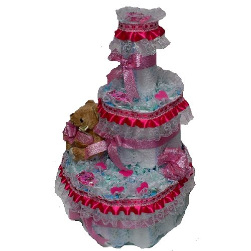 こちらは3段のおむつケーキになります。 おむつケーキ全体を白いレースで贅沢に包み、ピンクのレースとリボン、可愛いベアのぬいぐるみでアレンジしました。 おむつは一枚一枚OPPフィルムで個包装していますので清潔・衛生的です。 しばらく飾って楽しめて、その後、紙おむつを使用できる・・・ということで実用的で大人気の「おむつ」でできたデコレーションケーキ。出産祝いなどに最適。