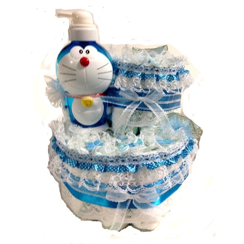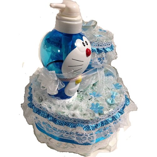 可愛いシャンプーボトルが付いた【おむつケーキ】。男の子への出産祝いに最適です。ドラえもんのビッグサイズのバスタオルも付いています。 たっぷりと白レースを使い、サテンリボン、フリルリボン、メタルリボンで飾りました。水色のリボンモチーフをアクセントにしてあります。 おむつは一枚一枚OPPフィルムで個包装していますので清潔・衛生的です。 しばらく飾って楽しめて、その後、紙おむつを使用できる・・・ということで実用的で大人気の「おむつ」でできたデコレーションケーキ。出産祝いなどに最適。