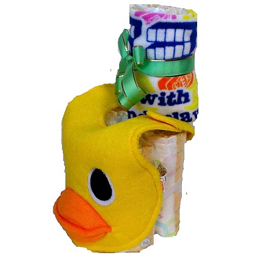 おむつケーキにあひるの立体スタイとペッツのミニタオルを付けました。実用的なおむつケーキです。 おむつは一枚一枚OPPフィルムで個包装していますので清潔・衛生的です。 しばらく飾って楽しめて、その後、紙おむつを使用できる・・・ということで実用的で大人気の「おむつ」でできたデコレーションケーキ。出産祝いなどに最適。
