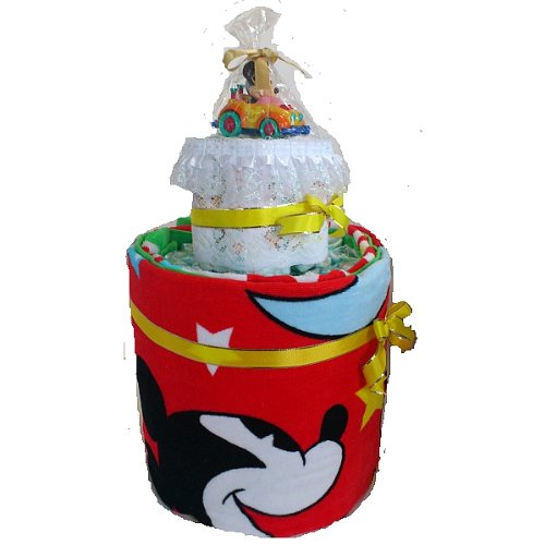 おむつケーキ【3段】パンパースM使用ミッキーのゼンマイで動く車とバスタオル付 出産祝いオムツケーキ
