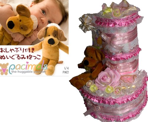 こちらは紙おむつを45枚使用した3段のおむつケーキになります。存在感たっぷりです。とても華やかでゴージャスなおむつケーキになっています。画像は犬のぬいぐるみですが、こちらの商品に付属するのは羊のぬいぐるみとなります。 おむつケーキ全体を白いレースで贅沢に包み、ピンクのフリルレース、ピンクのサテンリボンとメタルリボン、お花などで豪華に飾りました。犬のぬいぐるみは取り外し可能なおしゃぶりが付いていますので、出産祝いにぴったりです。 おむつは一枚一枚OPPフィルムで個包装していますので清潔・衛生的です。 しばらく飾って楽しめて、その後、紙おむつを使用できる・・・ということで実用的で大人気の「おむつ」でできたデコレーションケーキ。出産祝いなどに最適。