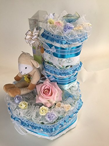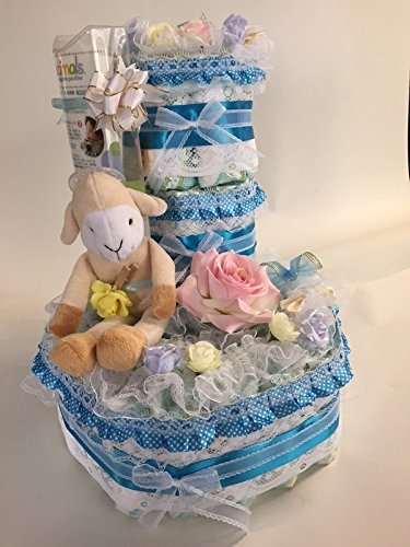 おむつケーキ【3段】パンパースM使用おしゃぶり付き羊ぬいぐるみ 出産祝いオムツケーキ男の子用
