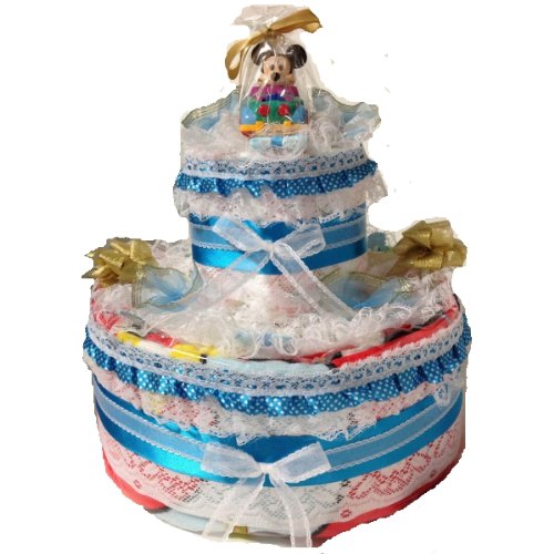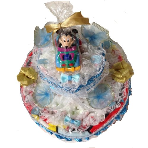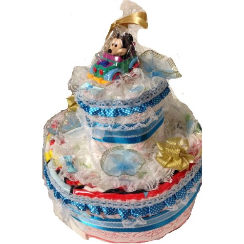 こちらは紙おむつを26枚使用した2段のおむつケーキになります。存在感たっぷりです。とても華やかでゴージャスなおむつケーキになっています。 おむつケーキにディズニーのバスタオルを巻き、ミッキーの車(ゼンマイで動きます)をトッピングしてあります。赤ちゃんの出産祝いに最適です。※ミッキーの車は色が数種類ありますので、画像と違う色になる場合がございます。 おむつは一枚一枚OPPフィルムで個包装していますので清潔・衛生的です。 しばらく飾って楽しめて、その後、紙おむつを使用できる・・・ということで実用的で大人気の「おむつ」でできたデコレーションケーキ。出産祝いなどに最適。