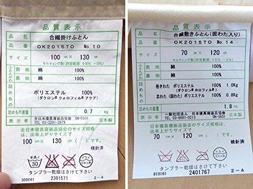 - 【敷きふとん】品番:OK2015TO No.14/サイズ:70×120cm/側生地:綿100%/詰め物:巻きわた ポリエステル100%(ダクロンホロフィル)1.0kg、芯わた(固わた)ポリエステル100% 0.8kg、詰め物重量:1.8kg