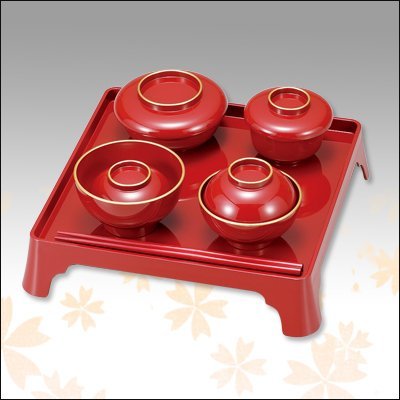 (商品サイズ) 膳:277×277×57mm ・ 飯椀:直径100×58mm 汁椀:直径92×70mm ・ 平椀:直径110×55mm 坪椀:直径85×60mm ・ 箸225mm (材質)表面塗装の種類・・・ウレタン塗装/素地の種類・・・ABS樹脂 (製造国)日本