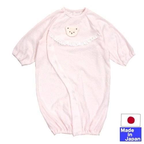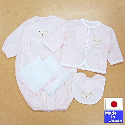 ツーウェイオール くまワンポイント セット (ツーウェイオール+カーディガン+スタイ+ガーゼハンカチ×2枚) 日本製 綿100% サイズ50-70 (白いクマ ピンク)