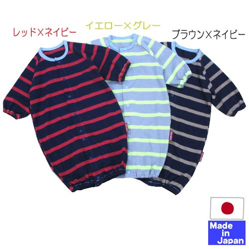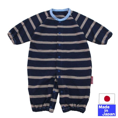 日本製 長袖 ツーウェイオール(かっこいいボーダー) 綿100% サイズ50-60cm (ブラウン×ネイビー)