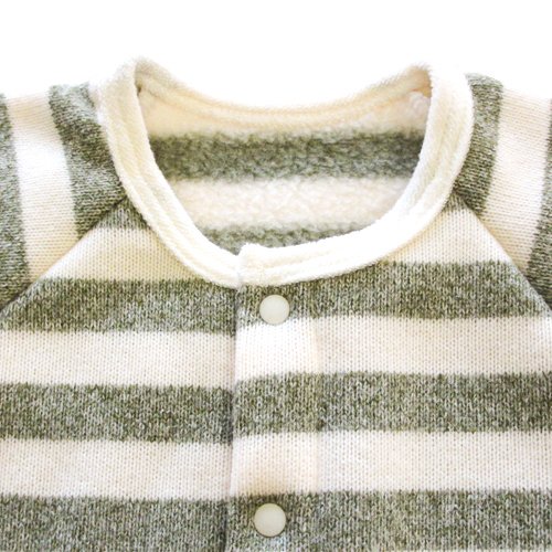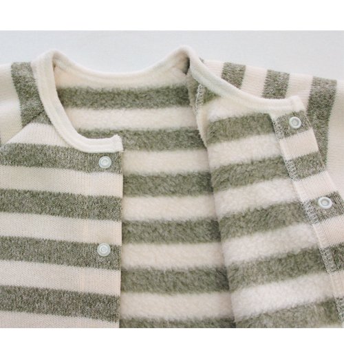 ふんわりやわらかい手触りのあったかフリース素材です。 内側はフラットになっています。 ボタンはスナップ、バイヤス部分はパイル地です。 ねんね時期はドレスで、足がぱたぱたしてきたらボタンを留めて使える2WAYです。