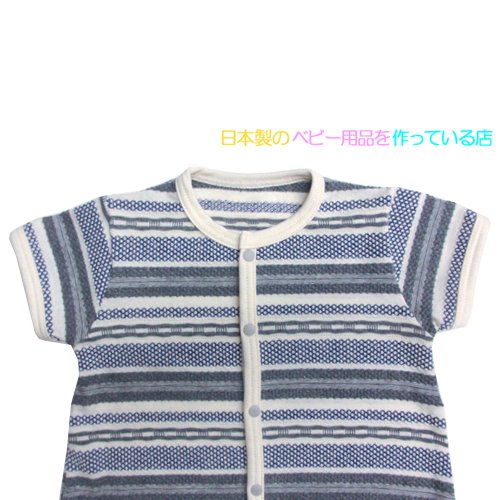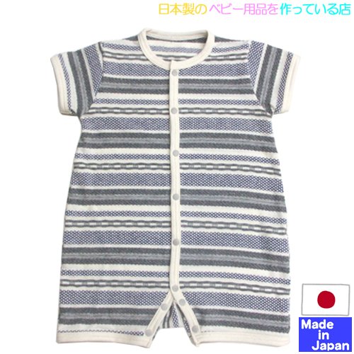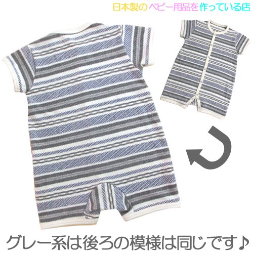 ★日本製★先染め天竺ボーダー 半袖前開ロンパース(60-70cm, グレー系) 綿100% サイズ60-70/70-80cm