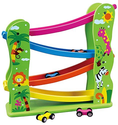 VIGA TOYのカラフルなデザインの木製スロープトーイです。 4台の車を1台ずつ4段スロープの上から走らせます。 車はスロープを下る毎にスピードアップして、1番下のスロープから飛び出します!