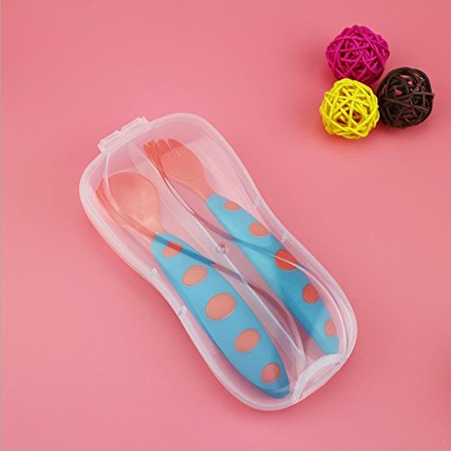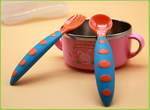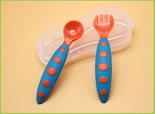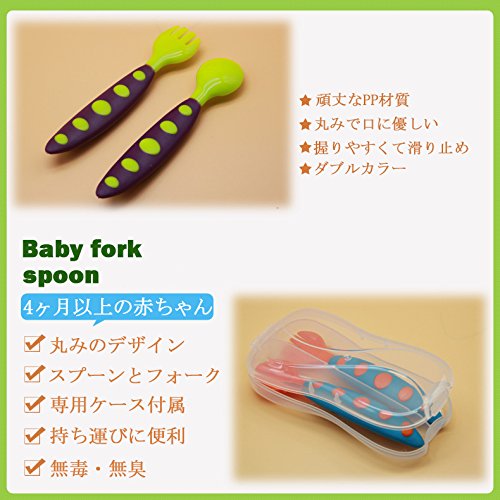 幸せな 赤ちゃん ベビー フォーク&スプーン ケース付き(6ヶ月から対象) プラスチック製 安全 無毒 軽い 握りやすい 持ち運びに便利 すくいやすい 全5色 (オレンジ+ブルー)