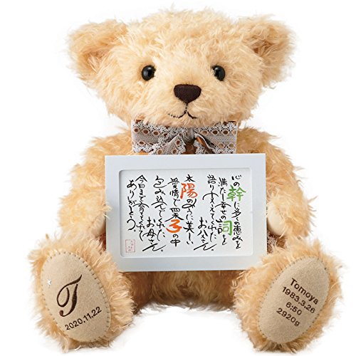 体重ベア 額入りお名前ポエム付きホイップ(完成品)1体お名入れ刺繍&送料無料身長約33cm【産まれたときの重さで作るウェイトドール ウェディングベア 名入れ 詩 花束贈呈 親ギフト】