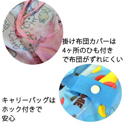 - 品質:(枕)[側]ポリエステル100%[中綿]ポリエステルわた(枕カバー)[側]ポリエステル100%、(掛けふとん)[側]ポリエステル100%[中綿]ポリエステルわた、(掛けふとんカバー)ポリエステル100%ホック付き、(敷きふとん)[側]ポリエステル100%[中材]ポリエステル100%、(敷きふとんカバー)ポリエステル100%、(キャリーバッグ)[表]ポリエステル100%[裏地]ポリエステル100%