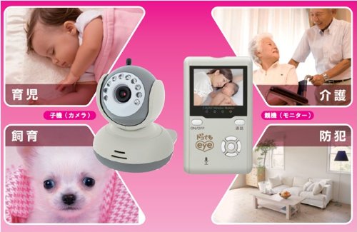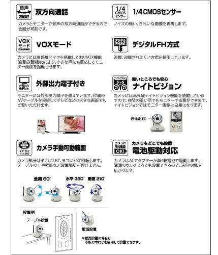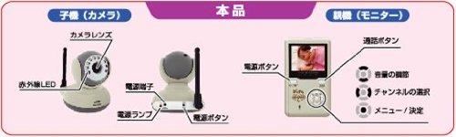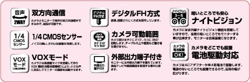 ・2.4インチTFT液晶を使用 ・ビデオ出力機能:付属のケーブルでご家庭のTVで親機と同じ映像が視聴可能 ・AC充電式で5時間作動(フル充電時) ・総務省の電波法工事設計認証品