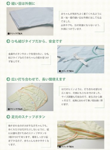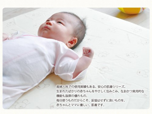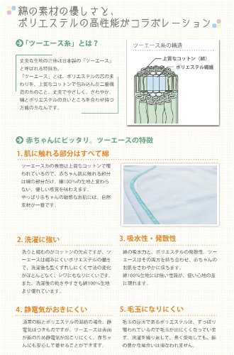 - 産婦人科で使われているから安心。丈夫な生地で、優しく長持ち。素材には「ツーエース」と呼ばれる綿とポリエステルの複合糸を使用することで、型崩れせず、洗濯・乾燥しても縮みにくい丈夫な生地に仕上がっています。