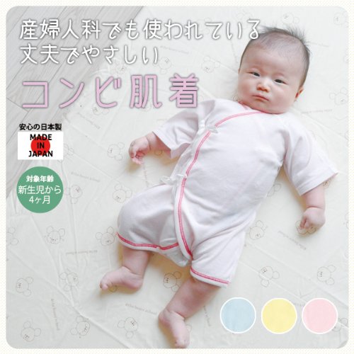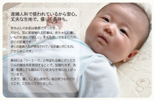産婦人科で使われているから安心。丈夫な生地で、優しく長持ち。赤ちゃんのお肌は敏感で汗っかき。だから、肌に直接触れる肌着は、赤ちゃんに優しいものを選んで欲しい。そんな思いで生まれたのが、この肌着です。多くの産婦人科で使用されている肌着と同じもの。だから安心です。素材には「ツーエース」と呼ばれる綿とポリエステルの複合糸を使用することで、型崩れせず、洗濯・乾燥しても縮みにくい丈夫な生地に仕上がっています。丈夫で、優しく、安心長持ち。毎日使うものだからこそ、こだわって作りました。
