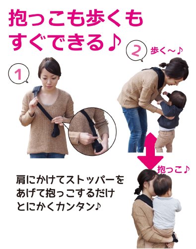 肩にかけてストッパーをあげ、お子さまを抱っこしたあとに持ち手を握るだけ!