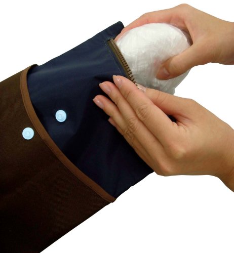 「わんわんベビー 消臭ポーチおむつ用」は、使用済みのおむつなどのニオイもれを防止する紙おむつ処理袋です。本体生地に抗菌・防臭・消臭機能のあるバイオライナーRを使用しているので、不快なにおいを除去します。ポーチはファスナーを閉め、さらに上部を折りスナップボタンで留める安心2重ロック構造。折り畳み、ベルトでまとめれば手のひらサイズになるので持ち運びにも便利です。スナップボタン付きのベルトで、ベビーカーや車のヘッドレストなどにポーチをかけることができます。使用後の紙おむつ(ビックサイズ)が約3枚入ります。ポーチの外側には携帯用おしり拭きなどが入れられるポケットが付いています。 使用方法 *水分を多く含んだものを入れる場合はビニール袋などに入れてからポーチに入れてください。