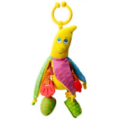 「タイニーラブNEWフルーティパルス(バナナ)」は、いろんな所にぶら下げられるおちゃめなバナナ(お出かけおもちゃ)です。指先を器用に動かしたり、お話したり。遊びの中からいろんな能力が身についていきます。バナナの皮をむくと、中からとぼけた笑顔がこんにちは。手が伸び縮みしたり、手のひらは歯がためになっていたり、楽しいしかけがいっぱい。クリップでベビーカー等にぶら下げられるから、お家でもお外でも大活躍です。