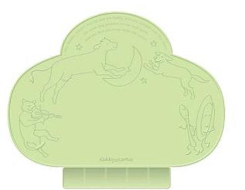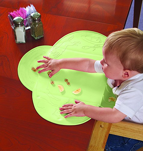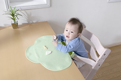 テーブル面に広げれば、ワイドな受け皿として、食べこぼしをキャッチする。サッと拭けばきれいになるから、"手づかみ"の頃には直接食べ物をのせてお皿のように使って。裏面には吸盤がついているので、滑りにくい構造。くるくる丸めて受け皿部にすっぽり収納できるので、おでかけ時携帯できて大活躍。