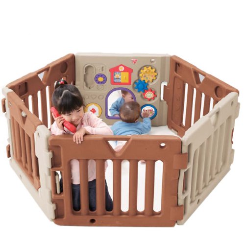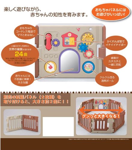 赤ちゃんの創造的な知育を実現する楽しい遊びがいっぱい。 従来のサークルではかなえられない理想的な一人遊びが可能になりました。 赤ちゃん、お子さまを不安にさせないように視界性はそのまま。パネルの内側を独自のフラットデザインにすることで足の挟み込みを軽減します。 赤ちゃんの創造的な知育を実現する楽しい遊びがいっぱい。 閉塞感もなく赤ちゃんが気分良く一人でいられますから、お母さんも安心して楽に育児が出来ます。 また、収納時はコンパクトにまとまります。 トイパネルにはあそびがいっぱい! ●コードレス電話でママにコール ●かくれんぼ窓でイナイイナイばー ●歯車がカチカチと一緒に回転 ●赤ちゃんには不思議に新鮮、おおきな鏡 ●クルクル回る透明ボール ●小鳥のボタンを押すと世界の童謡が流れます。 (24曲:ゆかいな牧場、きらきら星など) パネル6枚(茶3枚・ベージュ1枚・扉1枚・おもちゃ1枚)