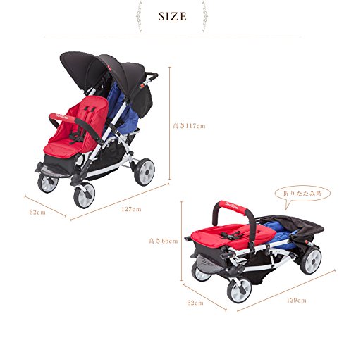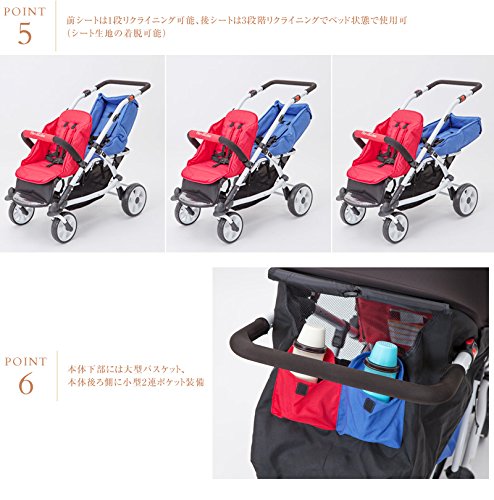 ・前シートは1段リクライニング可能、後シートは3段階リクライニングでベッド状態で使用可(シート生地の着脱可能) ・本体下部には大型バスケット、本体後ろ側に小型2連ポケット装備。